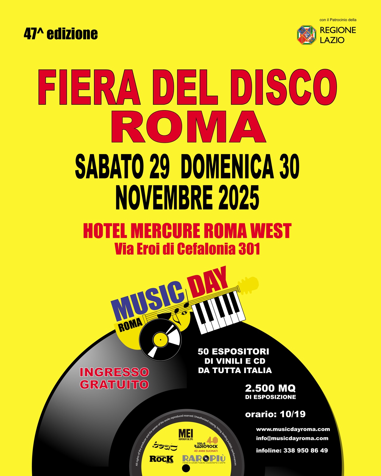 Seconda edizione autunnale del Music Day Roma, l’attesissima Fiera del Disco della Capitale, come sempre ricca di eventi e protagonisti di primo piano, oltre che di migliaia di occasioni d’acquisto fra dischi in vinile, cd, dvd, gadget, oggettistica e memorabilia musicale.